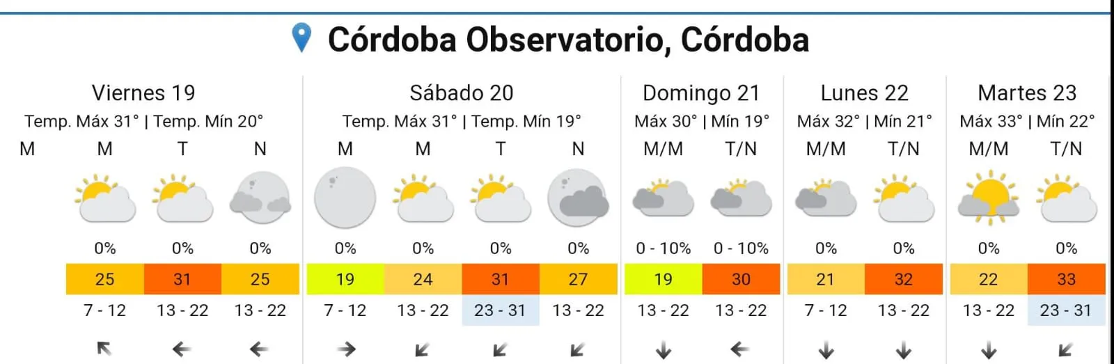 Para el domingo, en tanto, el SMN prevé leve descenso de temperatura, cielo mayormente cubierto, pero sin precipitaciones y una máxima que rondará los 30º. En el inicio de la próxima semana, se espera intenso calor con máxima que rondarán los 33º.