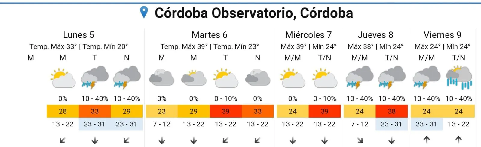 Tras el respiro del domingo, el SMN prevé una semana con intenso calor donde las máximas oscilarán entre los 33° y 39°, recién el viernes se espera que cedan las temperaturas extremas. Hay alerta por tormentas para el centro y sur provincial