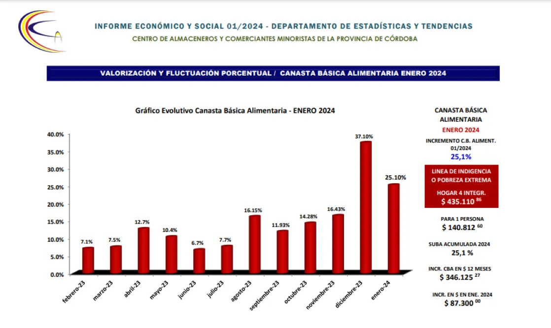 La línea de indigencia -para ese mismo tipo de familia de 4 integrantes- se situó durante enero pasado en $ 435.110, según el valor registrado de la Canasta Básica Alimentaria, que sufrió un incremento de 25,1 %.