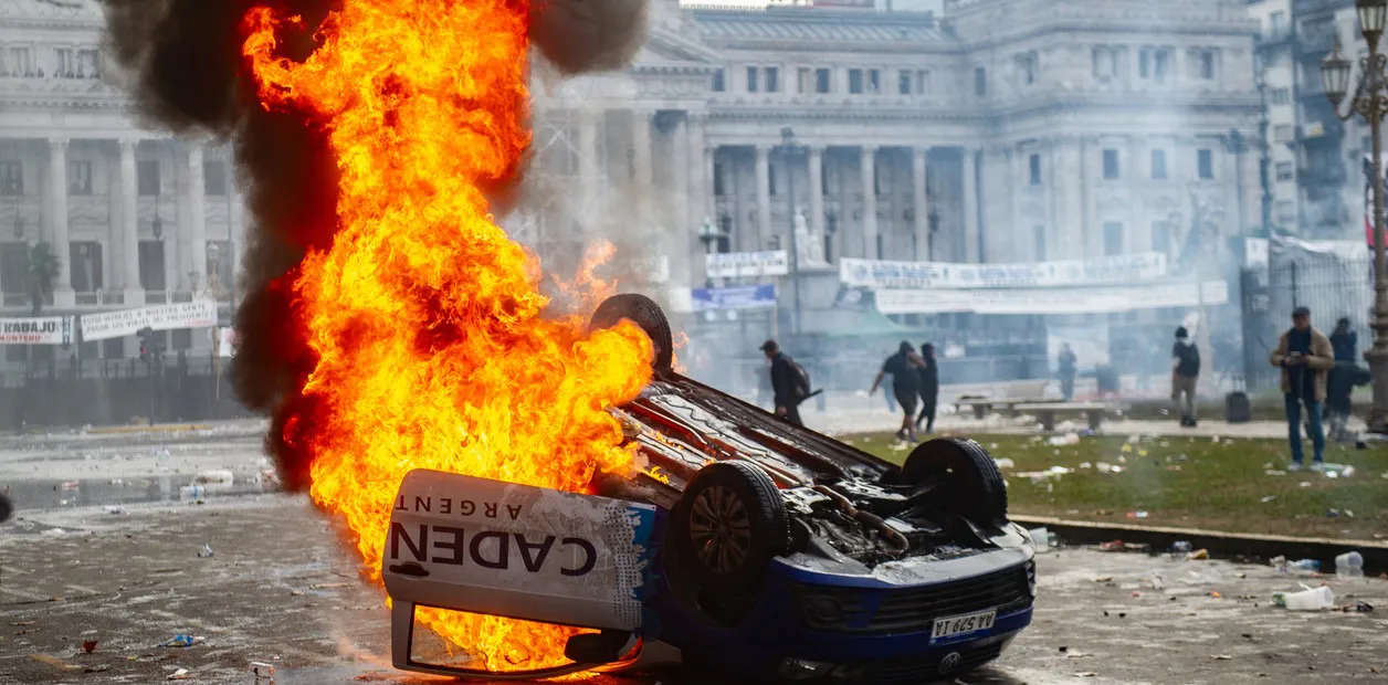 Este miércoles, en medio de la brutal represión durante el tratamiento de la Ley Bases en el Senado de la Nación, manifestantes dieron vuelta e incendiaron un móvil de Cadena 3 frente al Congreso de la Nación.