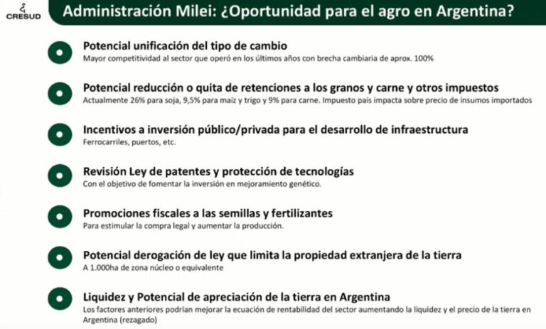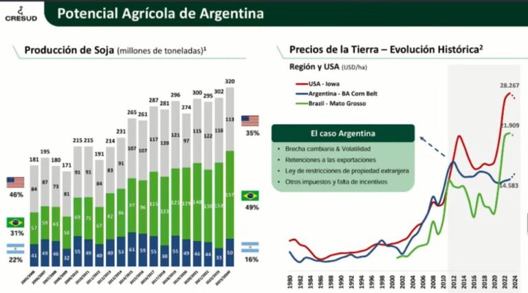 En lo que respecta al negocio agrícola de la presenta campaña 2024/25, señaló que “los números del negocio cierran” y que “si el productor vendió a 170 u$s/tonelada y sobrevivió, a 270 u$s/tonelada sí le sigue cerrando. Son márgenes más ajustados, pero son ganancias. Con 3,0 a 3,5 toneladas/ha de soja y esos precios, el campo tiene márgenes positivos”.